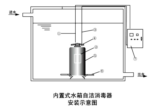 水箱自潔消毒器由兩部分組成:循環釋能器和能量控制器。能量控制器采用較好的微電腦技術控制使循環釋能器工作始終保持佳狀態。循環釋能器由循環水泵、釋能器、吸水管、布水器(出水管)等組成,放置在水箱、水池底部中間,所附控制電纜與能量控制器相連,安裝時不需破壞水箱、水池和原有管路。
